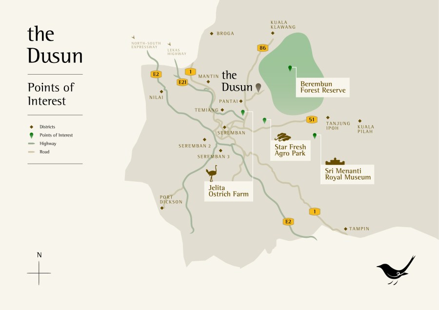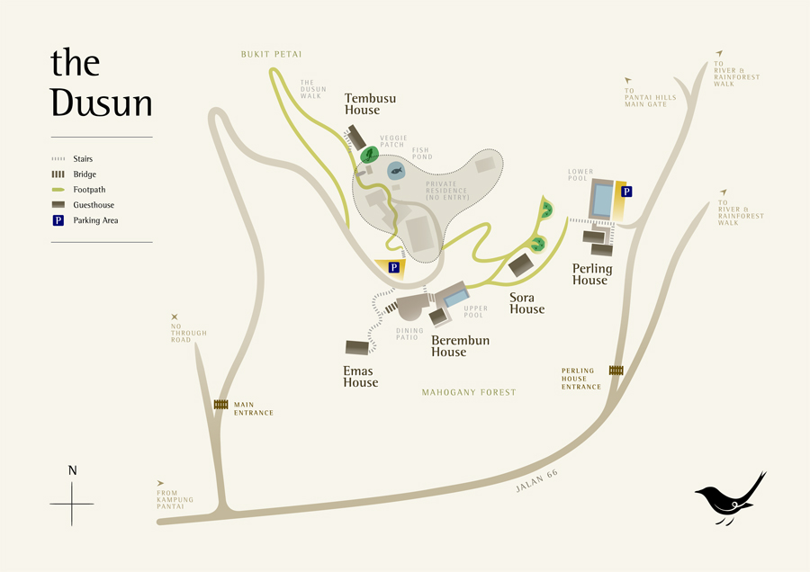 The Dusun is a small eco-resort on a durian orchard. With five fully equipped bungalows, guests can enjoy privacy, the calm songs of birds, and lovely views of the distant Mantin hills and Berembun Forest Reserve. It is the perfect place to spend quiet quality time with loved ones or by yourself. With guest houses on the top of a little hill, you can enjoy cooler temperatures at night. Each house has fully equipped kitchens and outdoor barbecues which there are light for guests in the evenings. Minangkabau food traditional to Negeri Sembilan is also available.