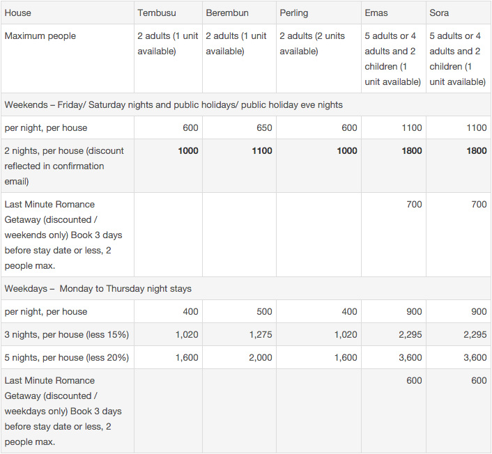 - Kitchen complete with crockery, cutlery and cooking utensils (except Berembun House)