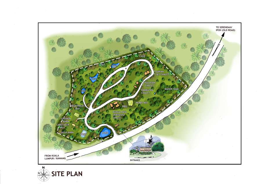 From KL Sentral Station, take KTM Komuter to Rawang KTM Station. It will take about 55 minutes for the 9 stops to Rawang. Then, take Setara Jaya bus no. 156 from SL 363 Pekan Lama Rawang heading for Bukit Beruntung. Stop at SL 452 Flat Bukit Rawang Jaya. Then, walk 500 m to the chalet.