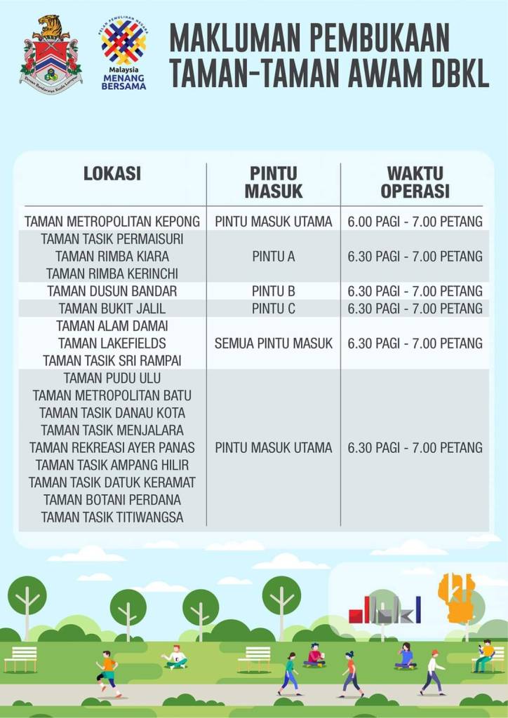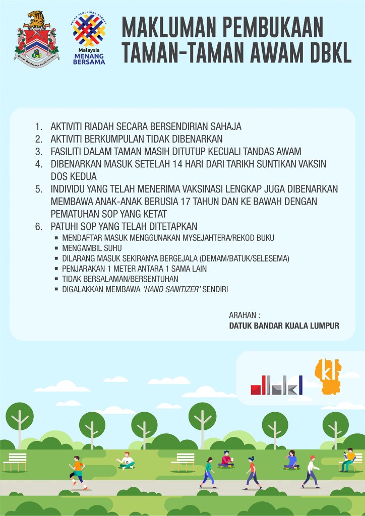 Good news for Klang Valley residents! DBKL announced that parks under their administration are now opening. This is a good news considering how long we cannot go to the park since the FMCO. But it is not without restriction since only individuals that fully vaccinated or kids with their fully vaccinated parent can enter the park. You are considered fully vaccinated if you are already 14 days after receiving the second dose. This is the case for Pfizer, AstraZeneca or Sinovac shot. For Johnson & Johnson or CanSino shot, you have to wait after 28 days.