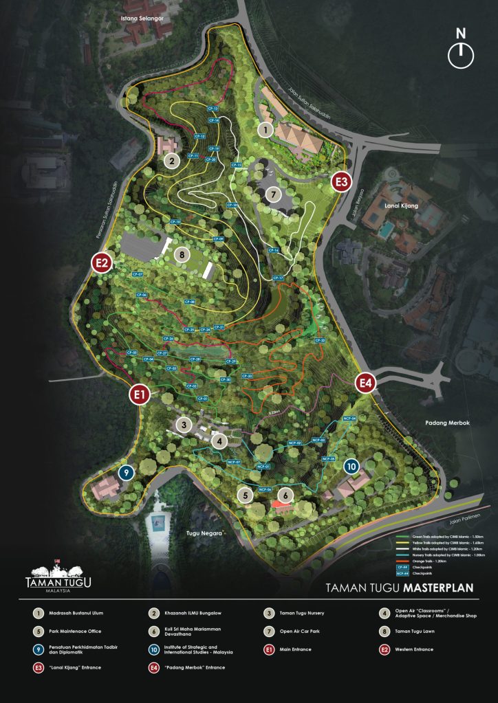 The trails are suitable for beginners and all age groups. Most of the trails are adopted by CIMB Islamic. The length of full loop of the main trails are: